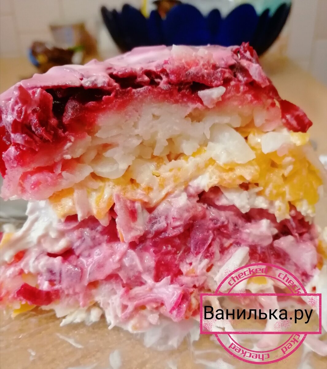 Третий слой - картошка, также подсаливаем и смазываем сметаной, кладем лук и завершаем свёклой, сново подсаливаем и смазываем немного сметаной.
