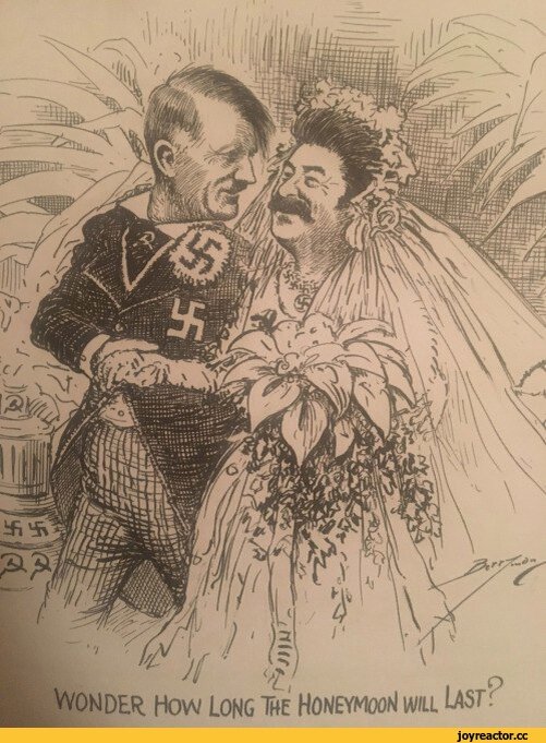 Карикатура из США август 1939 - подпись внизу пророчески гласит "Как долго продлиться медовый месяц?". Ровно через два года вермахт штурмовал Москву.