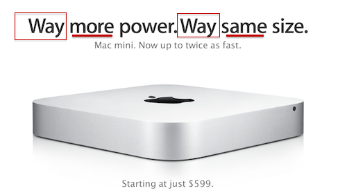 Пример 1 — «Way more power. Way same size». В переводе это бы выглядело примерно так — «Намного больше мощности. Намного тот же размер».