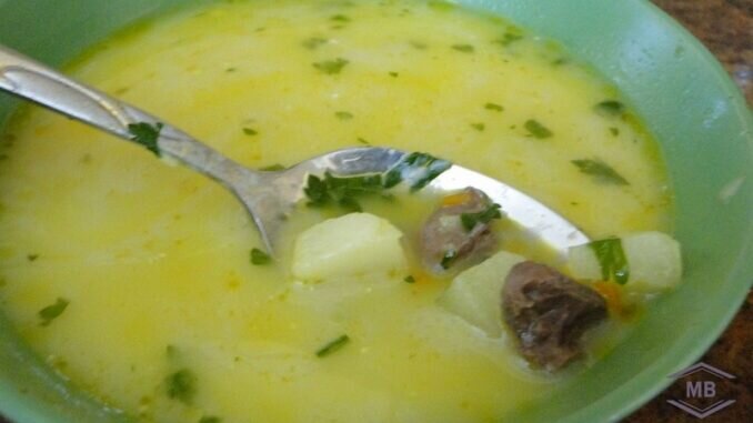 В конце варки добавляем плавленный сырок, нарезанный кубиками, и лапшу. Можно добавить в суп и нарезанную свежую зелень.