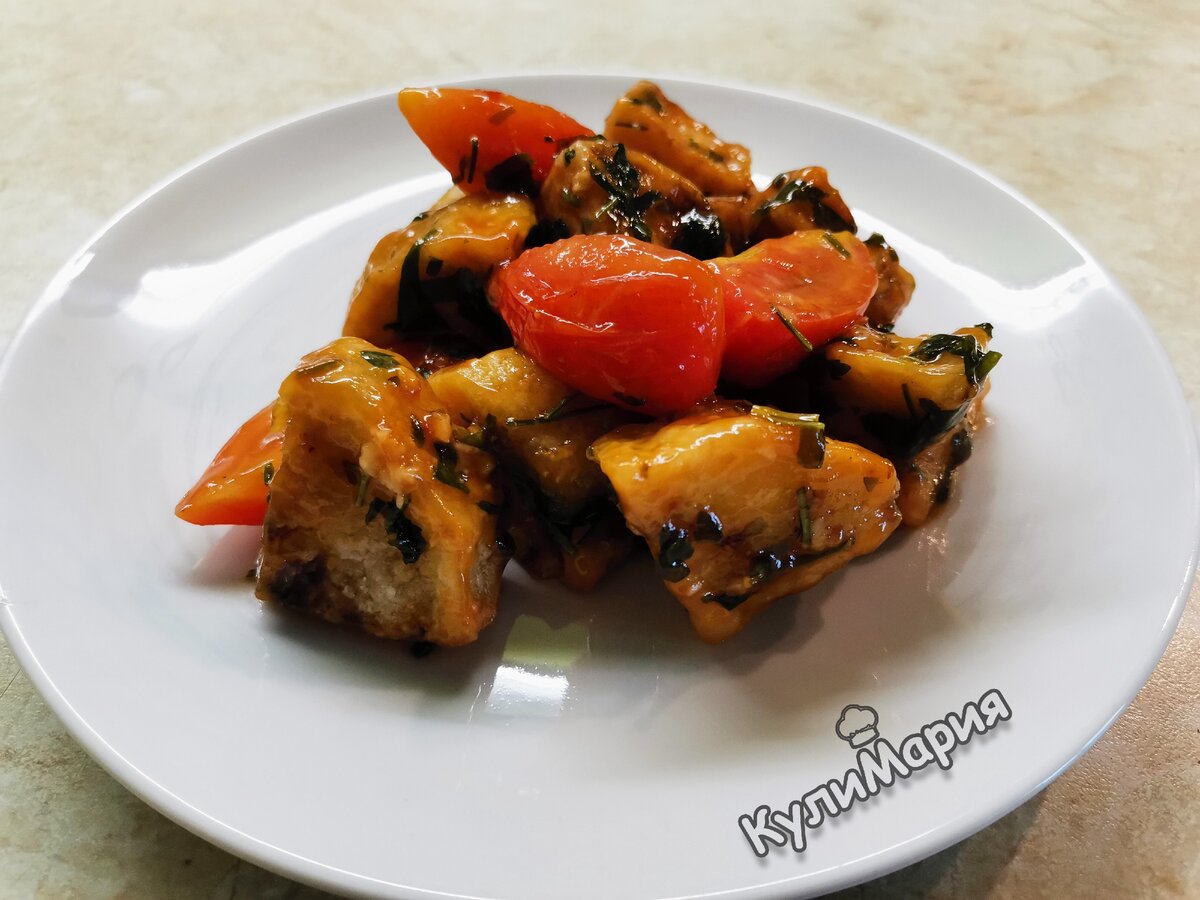 - В миску складываем жареные баклажаны, помидоры, заправку и добавляем выдавленный чеснок.
