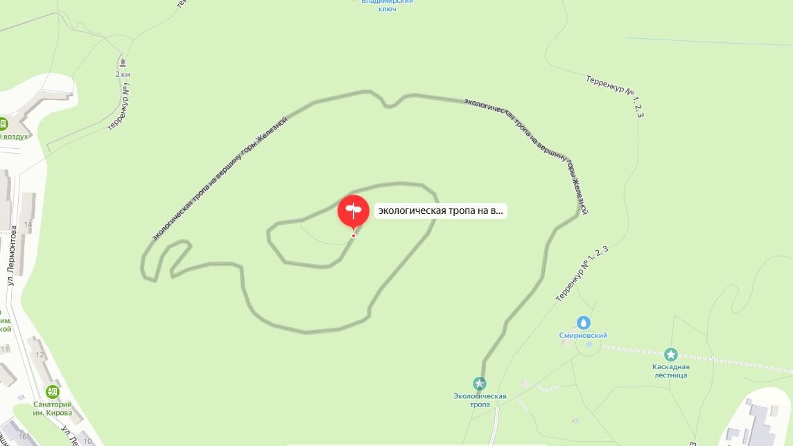 Экологическая тропа «Железная» проходит по территории одноименного памятника природы краевого значения «Гора Железная», который расположен в Предгорном районе, на северной окраине г. Железноводска, в 3 км севернее г.Бештау Протяженность экологической тропы – туда и обратно – около 7,0 км. Время прохождения составляет – 3,5 – 4,0 часа. Маршрут – пеший. Это пеший линейный маршрут с возвратом в начальную точку. Доминирующей составляющей является отдых посетителей в сочетании с получением информации о местных достопримечательностях и особенностях природного ландшафта. По сложности прохождения маршрут неоднороден. Посетители могут выбрать варианты сложности самостоятельно, в зависимости от своих физических возможностей и состояния здоровья. Например, по желанию, можно двигаться строго по серпантину, а можно «срезать» путь за счет совершения подъемов и спусков между витками серпантина, что существенно сократит время движения по маршруту. Маршрут тропы не является трудным для прохождения в ва