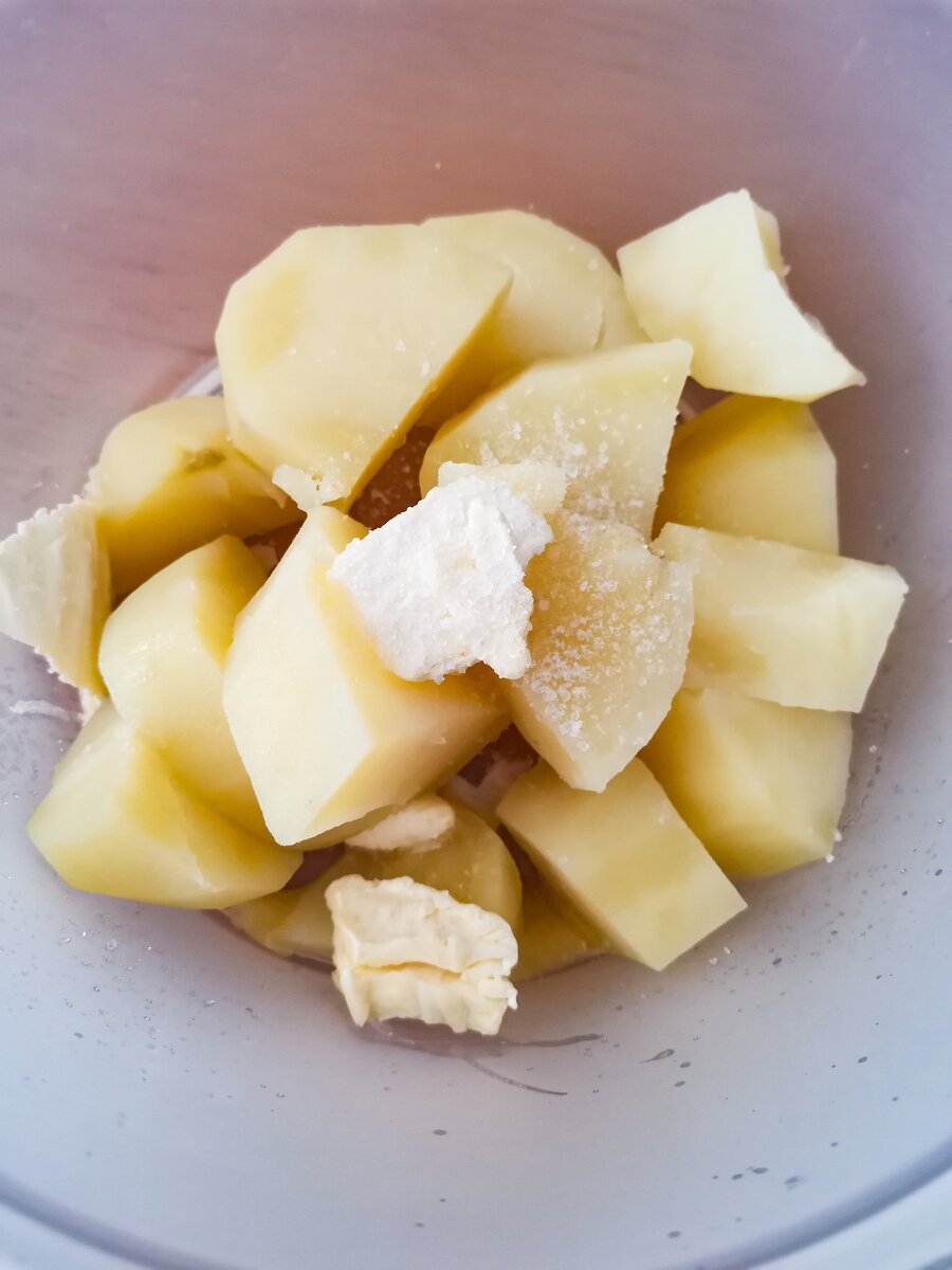За это время можно приготовить начинку: помыть, почистить и отварить картошку. Выложить в удобную миску, добавить соль и масло.