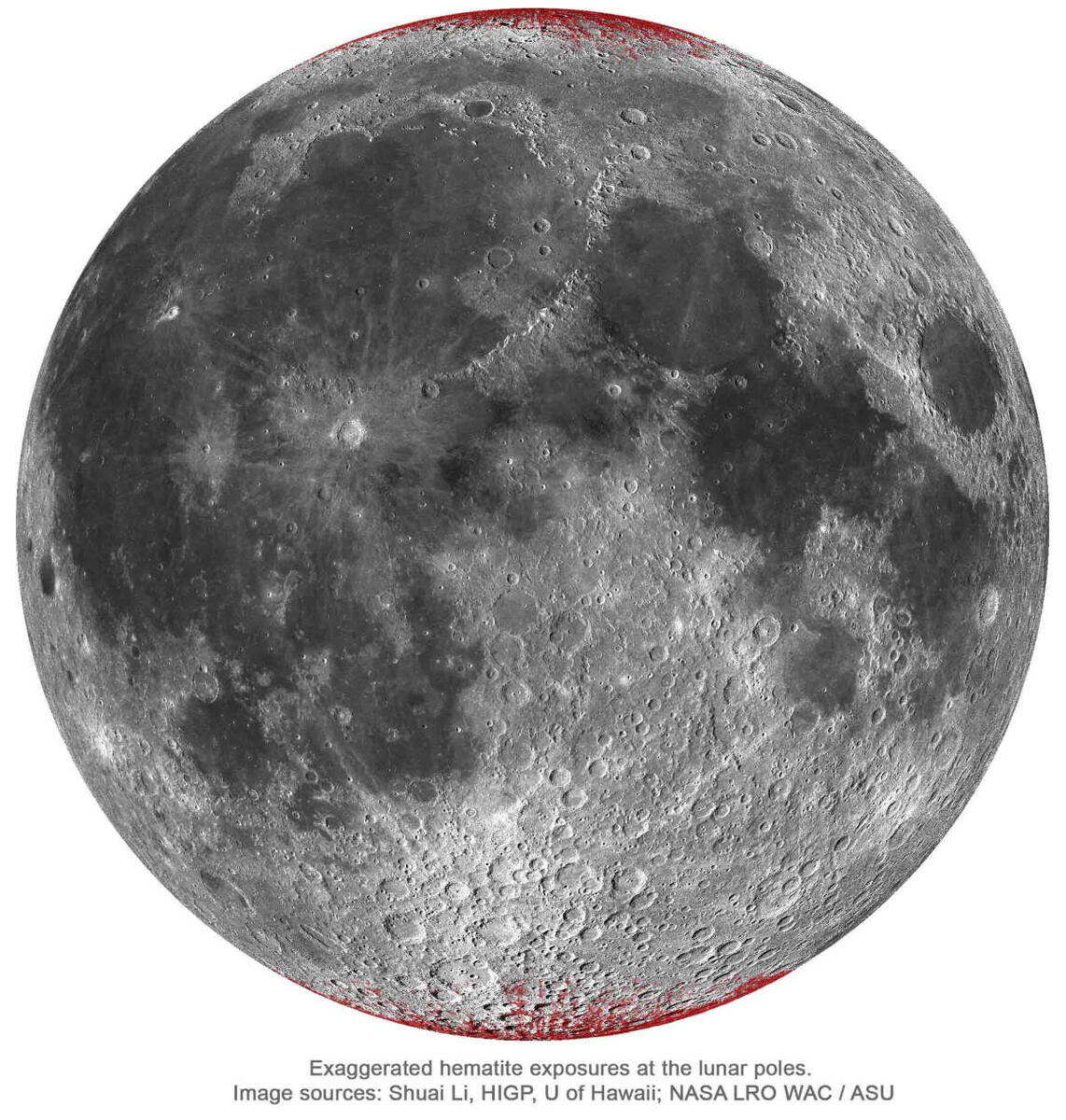 К удивлению многих планетологов, окисленный минерал гематит был обнаружен на поверхности Луны в области высоких широт, согласно новому исследованию, проведенному группой под руководством Шуая Ли (Shuai Li), ассистент-профессора Института геофизики и планетологии Гавайского университета в Маноа.