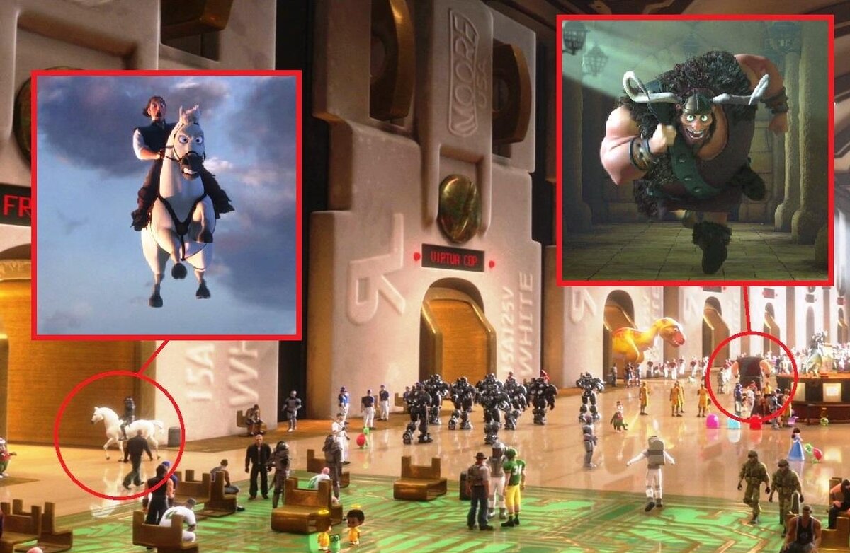 "Ральф" изначально и задумывался как проект, куда можно будет органично вписать самых разных персонажей: из комиксов, видеоигр и, конечно же, из других мультфильмов. Так, например, в одном из эпизодов мультфильма можно заметить, как по своим "рабочим местам" расходятся Флинн и Владимир из мультфильма "Рапунцель: Запутанная история".