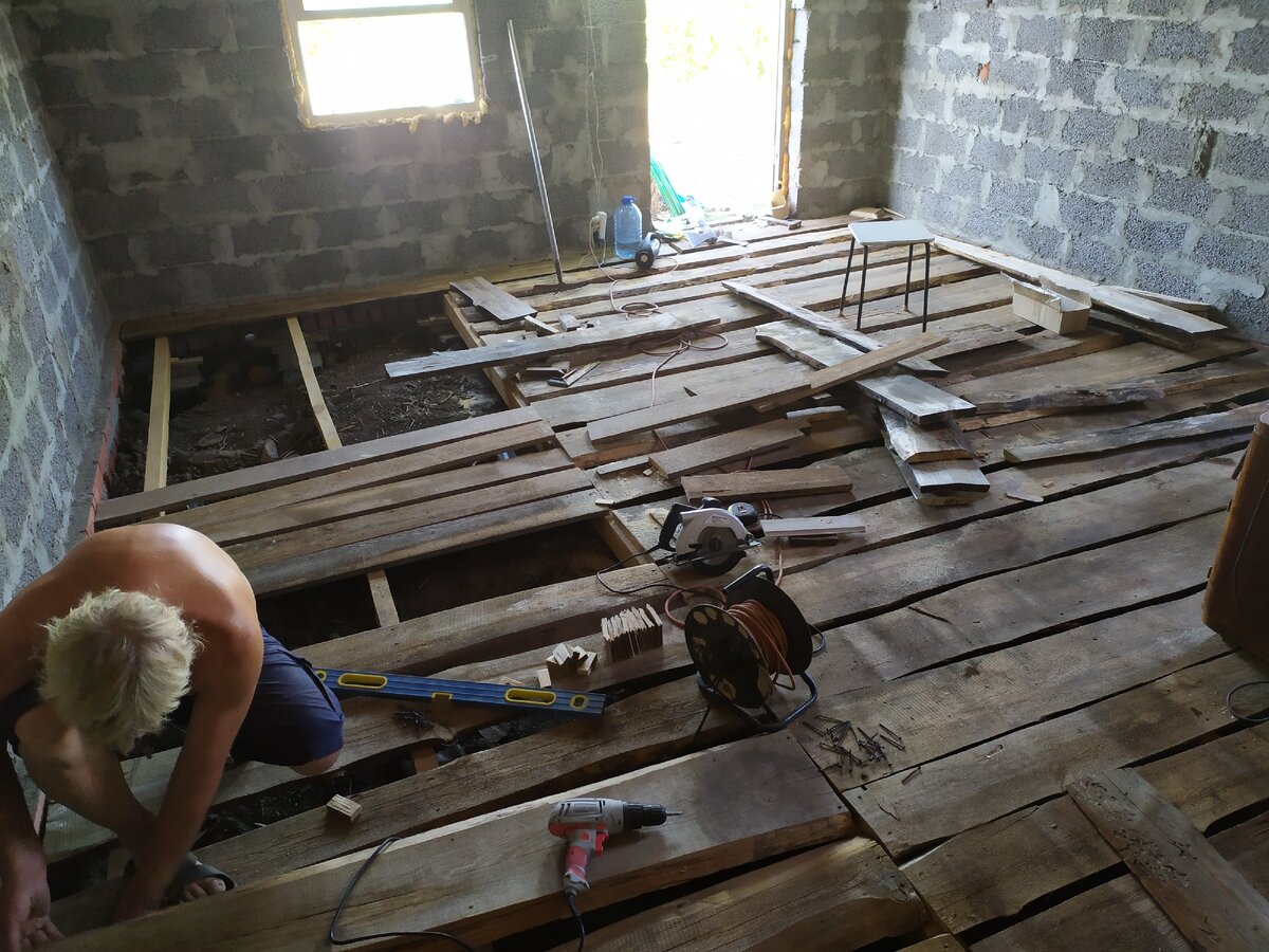 Сделал черновой деревянный пол в дачном домике потратив 1,5 тысячи рублей.