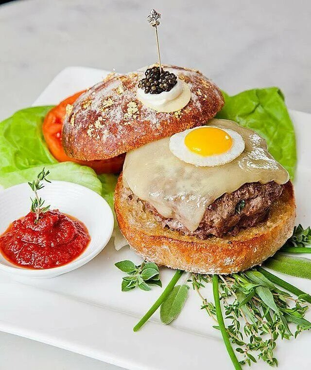 Самый дорогой бургер, так же занёсеный в книгу рекордов Гинесса называется let BURGER EXTRAVAGANT 400$ По словам автора он создан в честь национального месяца бургеров, путём проб и ошибку, что бы создать гармонию между вкусом и деньгами. Он состоит из говядины вагю с трюфельным маслом, булочкой обсыпаной чистым золотом золотой зубачисткой с брильянтом. Так же в состав входит сыр, который храниться в пещере в идеальных условиях 1,5 года . Допинг из черного трюфели. И даже кетчуп там необычный, он создан при помощи помидоров, так сказать "голубых кровей" Генетически идеальных На сыр сыпется икра Получил, самая дорогая в мире и сверху перепелиные яйцо