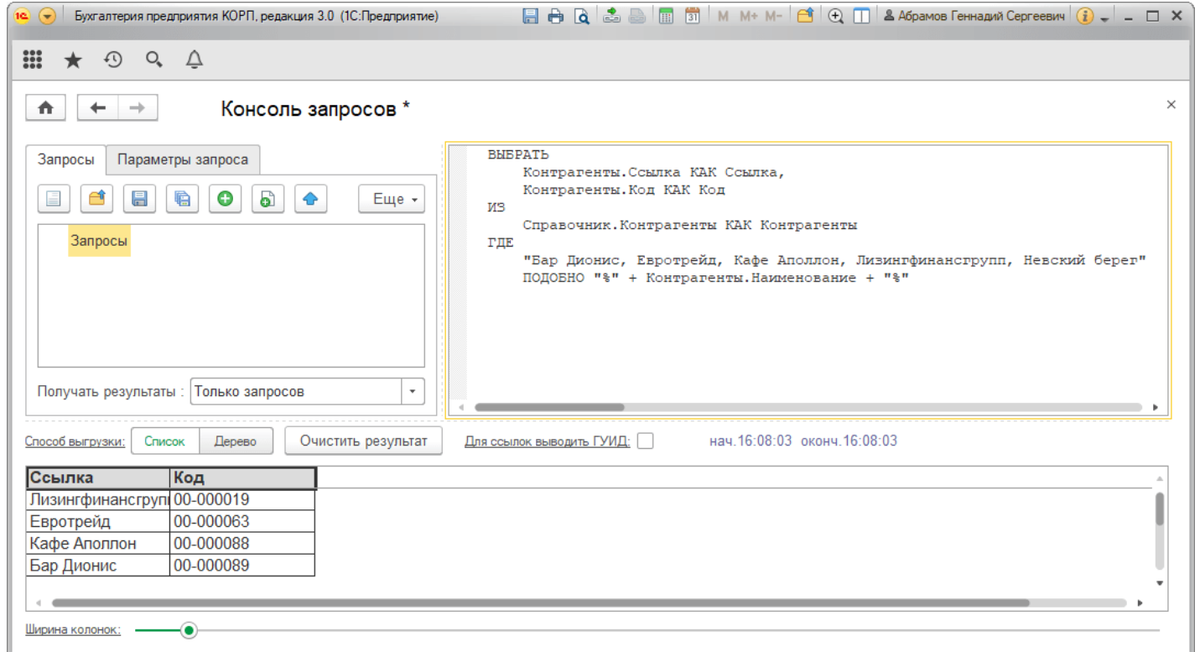Таким образом мы избавляемся от необходимости вручную прописывать список контрагентов в запросе, работа происходит в разы быстрее за счёт использования списка через запятую.