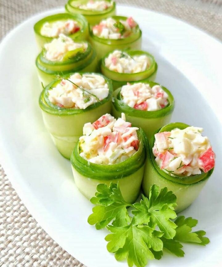 4) Смешать все кроме огурцов- получилась начинка. Выложить начинку на огурцы и завернуть.
