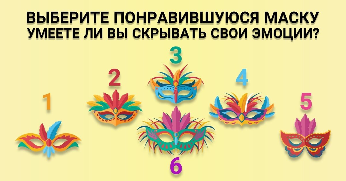 • Выберите одну маску, которая вам больше всего нравится. При выборе действуйте интуитивно! Только так вы сможете добиться отличного результата. Маска №1 Вы — открытая книга! Вы не умеете скрывать свои чувства и эмоции. Если честно, то вы и не желаете скрывать что-либо. Вам нравится быть таким человеком. Вы считаете, что лучше быть простым человеком, который ничего не прячет. Чтобы никто вас ни в чём не мог уличить. При этом вы становитесь лёгкой «мишенью». Маска №2 Вы всегда скрываете исключительно негативные эмоции. Надеваете маску