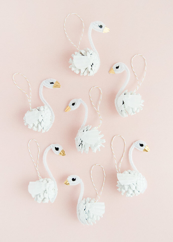 4. Вырежьте буквы D из белой бумаги для кексов, чтобы сделать крылья лебедя. Приклейте на каждую сторону шишки.