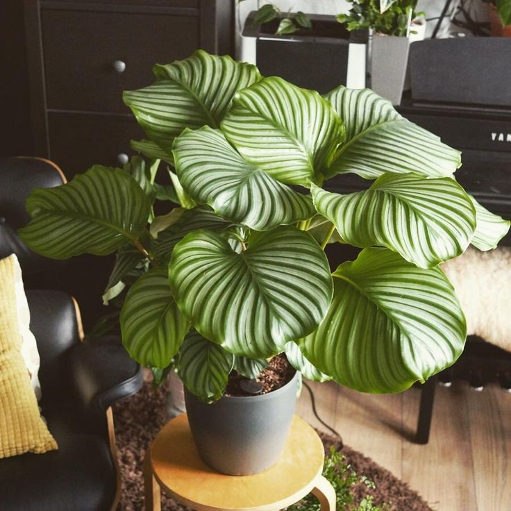 Калатея орбифолия — травянистый многолетник средних размеров с листвой экзотической окраски. У Калатеи орбифолия большие, почти правильные округлые листья, которые сидят на прямостоячих высоких черешках. Листовые пластинки тонкие, со слегка волнистыми краями. От центральной прожилки в обе стороны расходятся полоски, образуя на лицевой