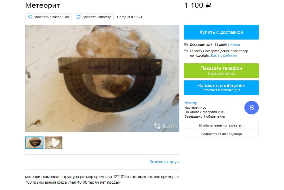 На одной всем известной торговой интернет-площадке периодически на глаза попадают объявления о продаже метеоритов. Интереса ради, с парой человек решил пообщаться и узнать - откуда же у них сие чудо на руках?! Их ответы заставляют умиляться. Один пишет, что камень достался от деда, как семейная реликвия. А тот был честный малый - сказал метеорит, значит так и есть. Другой отвечает, что нашёл