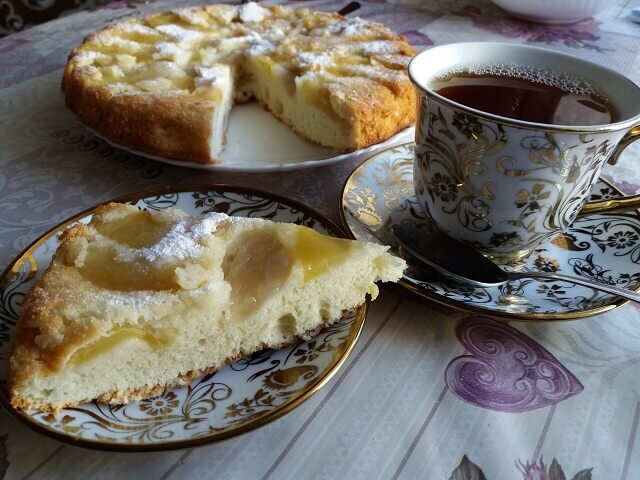 Готовую шарлотку нарезаем на порционные куски и подаем к чаю.