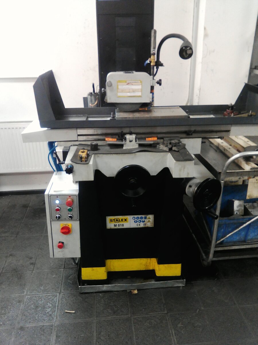 Станок изначально закупался новый, для нужд мехатроника по обслуживанию штампов, но денег на такой станок с автоматической подачей не хватало. Поэтому было принято решение купить шлифовальный STALEX M818 с ручной подачей, а затем уже доработать его. Первая идея это установить мотор-редуктор с тормозом и переключать направление вращения при достижении конечных точек. Сложность была только его закрепить на самом станке и выточить переходную муфту с вала редуктора на вал привода перемещения стола. Пока решали вопрос с креплением один из электроников предложил использовать пневмоцилиндр. Идея была поддержана и цилиндр был в наличии. Цилиндр разместили под столом, на удивление не составило труда его там закрепить. Подвели воздух, установили датчики в крайних положениях и о чудо все работает.