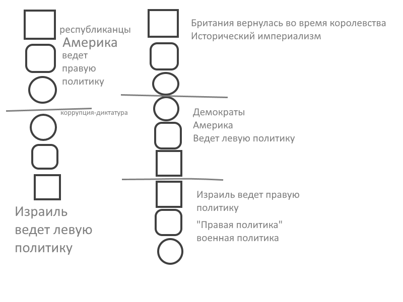 В мире есть всего две базовые идеологии. Одна - "правый блок" - армия. Ярмия устраивает милитаризм, а затем - империализм, и иерархию между людьми и странами. Вторая - "левый блок" - публицистика. Публицистика это культура, литература, и самое главное не "сила" а "смысл", язык, наследие. Партии тоже есть правые и левые. Например, в америке - Республиканская партия является правой партией. Они