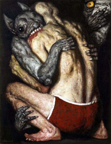 Борется ли этот человек или обнимает ужасное создание? Кого он пытается победить — дьявола или собственную тень? А в пылающем глазу адской твари само отражение Хаоса. Не там ли дикие войны, лукавые речи политиков, тлетворная атмосфера всеобщей лжи и ненависти?