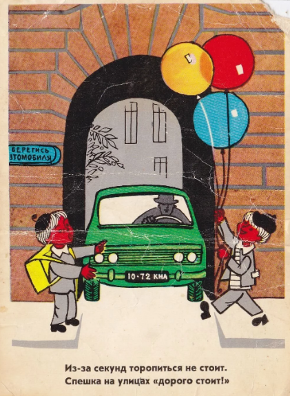 Карточки с правилами дорожного движения почему-то пользовались у советских детей особой популярностью. Может быть, потому что они чаще других встречались в продаже, может быть и потому, что рисунки с дорожной ситуацией были похожи на те, что время от времени публиковались в журнале "Наука и Жизнь" - в изображенной на картинке дорожной ситуации нужно было угадать вариант правильного поведения, что не всегда было просто.