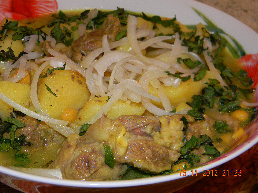 Я взяла баранину, нарезала небольшими кусочками. Туда же положила кавказский горох - нохут или ещё его называют нут (горох этот предварительно на ночь замочила в воде). Залила свежей водой и поставила на средний огонь. Варить нужно долго, часа 1,5 - 2. Потом туда же закинула мелко нарезанный репчатый лук, дальше продолжила варить. За полчаса до готовности положила картофель (нужно либо очень крупно резанный, как у меня, либо просто маленькие картофелины, потому что в оригинале картошка должна быть целыми клубнями). Минут через 5 положила туда же небольшой кусочек бараньего жира, резанного как можно меньше.