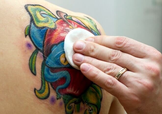 Через неделю после нанесения тату, следует прекратить накладывать повязку. Следующие 7-ь дней необходимо мыть и смазывать татуировку в среднем три-четыре раза в день. От наложения повязки следует отказаться.