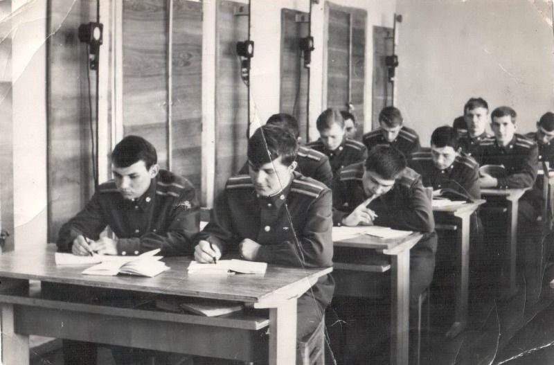 Курсант протаскивал провода через брюки , затем на тело и в рукав кителя. А в руке на конце провода был зажат наушник. За места, где были выведены провода с гвоздями остальные естественно не садились . Затем экзаменующийся бравой походкой заходил в класс , брал билет и громко объявлял его номер, а за дверью стоял “ подельник “ и передавал номер билета курсанту, который сидел в Ружейной комнате на готове с конспектами и учебниками. Экзаменующийся садился за подготовленный стол, ставил на гвозди сапоги, появлялся контакт. Затем прикладывал руку с зажатым микрофоном к уху и записывал ответ на билет, который передавали ему из Ружейной комнаты. Связь была односторонней, поэтому здесь была важна четкость передаваемого текста ( дикция ) , расторопность и невозмутимый вид записывающего.