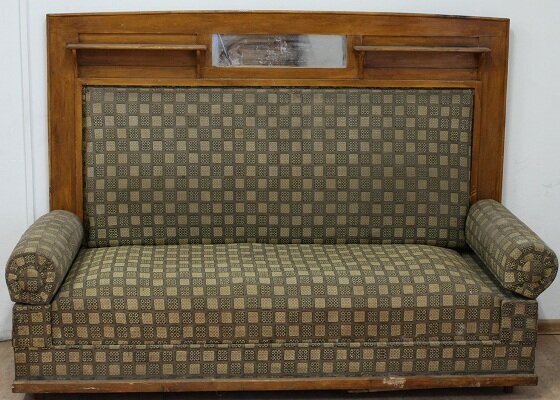 Вот такие диваны прекрасно помню, они из моего детства. Чаще всего диваны были обиты черным или коричневым дермантином, валики на диване откидываются, этим увеличивается длина, сам-то диван небольшой.
