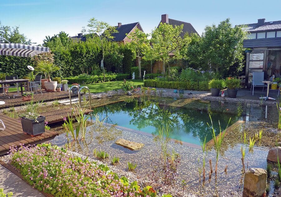 Материалом для деревянной рамы, обрамляющей купальную зону, стала необработанная древесина дугласовой пихты, которая без доступа воздуха не гниет под водой. Благодаря такой раме купальный пруд оказался визуально приподнятым над остальной акваторией. Зона регенерации и водоем для купания расположены под единой поверхностью воды, и только за счет избыточного подпора создается барьер, отделяющий их друг от друга. Растения для мелководного участка (зоны регенерации) подбирают по совету дизайнеров и озеленителей.