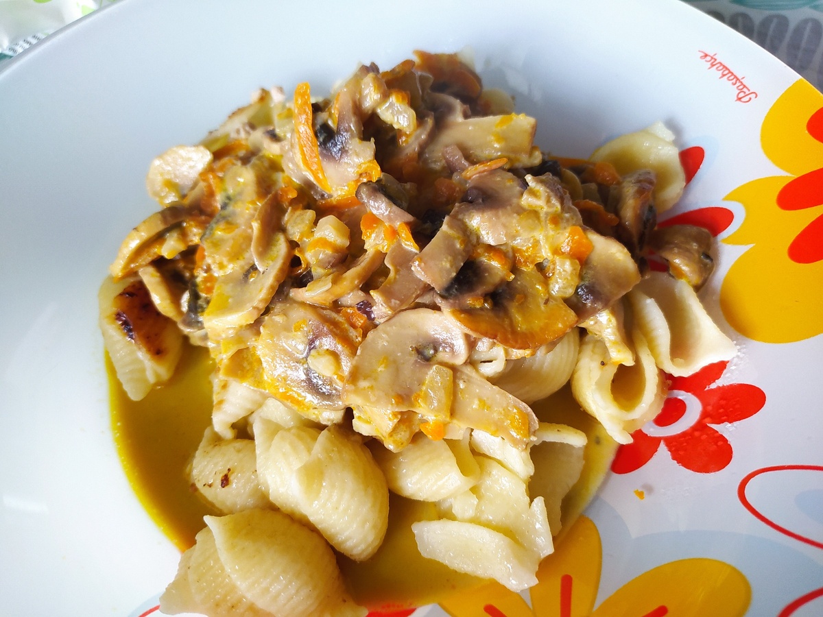4. после обжарки добавляем молоко, солим (перчим) и оставляем тушится минут 15. Гарнир на ваш вкус, у нас были макароны ракушки.
