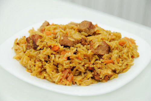 Мясо вымыть, обсушить, разрезать на кусочки. 2. Очистить, помыть и нарезать тонкими полукольцами репчатый лук. 3. Морковь очистить, помыть и нарезать соломкой. 4. Сделать зирвак (это основа плова, а именно — мясо, морковь, лук и специи). Для этого разогреть казанок. Налить растительное масло. Хорошо его прожарить. Выложить подготовленный лук. Жарить до золотистого цвета около 5–7 минут, помешивая. 5. Выложить подготовленное мясо. Все готовить до состояния, когда мясо покроется зажаренной корочкой, около 10 минут. 6. Затем добавить морковь. Обжарить все вместе, помешивая, 3–5 минут. 7. Вскипятить чайник. Обжаренные овощи и мясо залить кипятком (вода должна покрывать мясо с овощами где-то сантиметра на два). Посолить, поперчить, добавить специи для плова. Варить на среднем огне 20 минут. 8. Положить рис, осторожно разровнять его по поверхности (но не перемешивать!). В серединку поместить головку чеснока. Долить воды так, чтобы она покрывала рис выше на 2 см. Варить плов на максимально