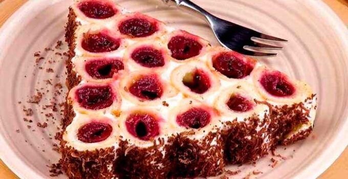 - Кладем второй слой из четырех трубочек, наносим слой крема. Формируем третий слой из трех вишневых трубочек, смазываем кремом.