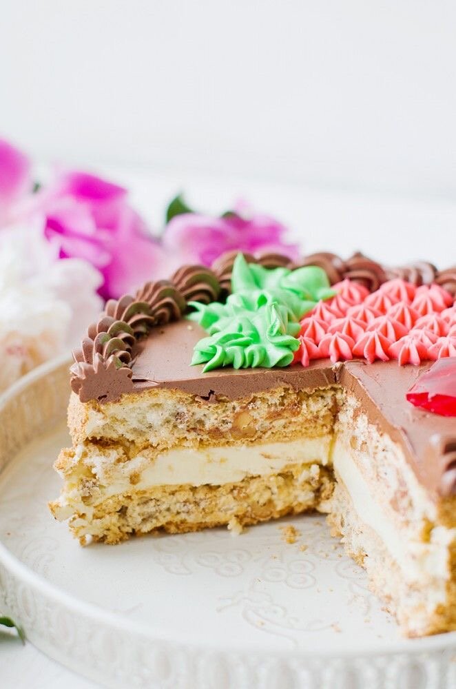 - Из данного количества ингредиентов получается торт высотой 6,5-7 см. и диаметром 26 см. Нам предстоит испечь два хрустящих коржа с орехами, а также приготовить два крема. Крем Шарлотт идет внутрь торта, а шоколадный используется, чтобы покрыть торт сверху.
