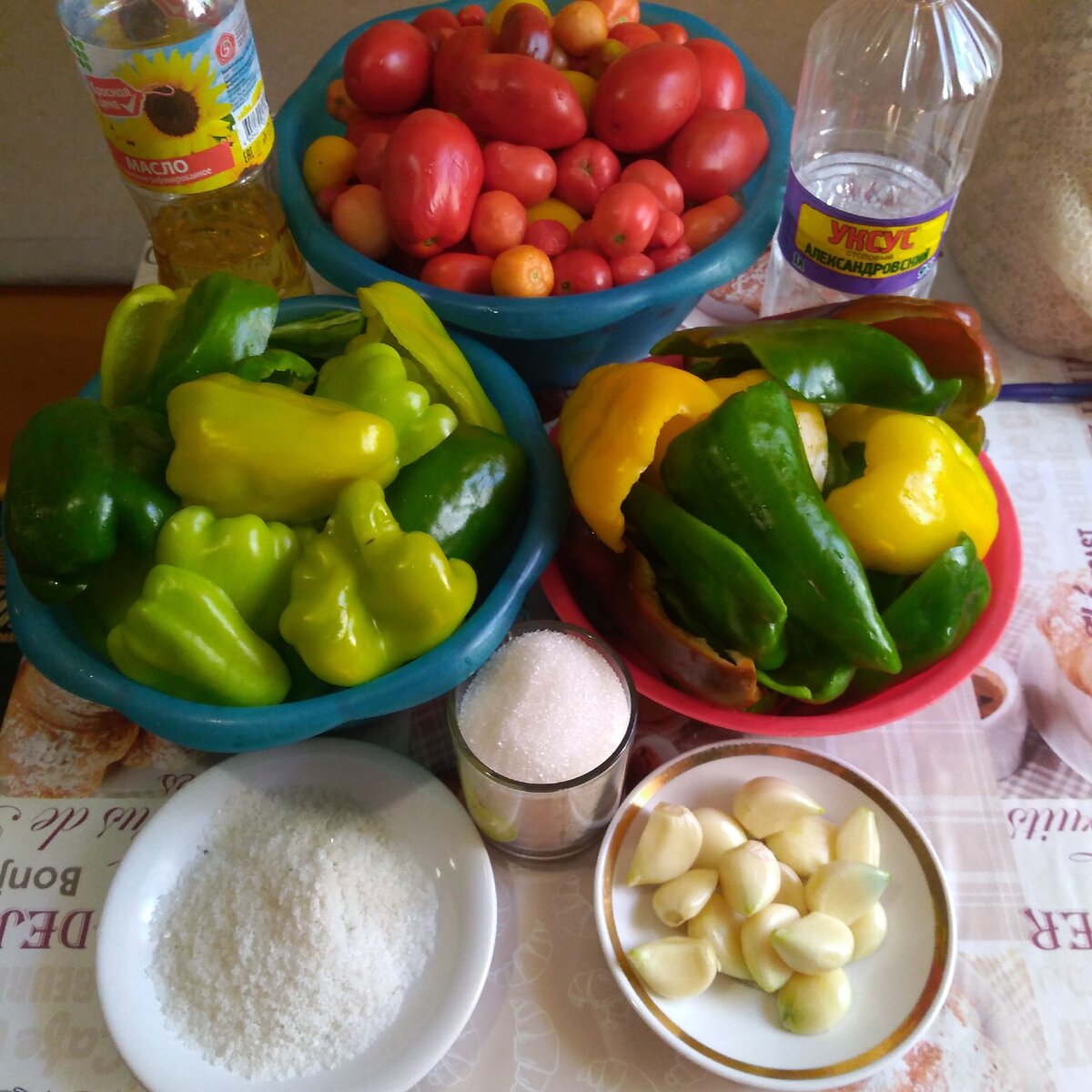 Я дам количество продуктов в расчете на 1 кг помидоров и 1 кг перца (как в оригинальном рецепте) и на то количество продуктов, что я использовала сегодня(в скобках). А вы смотрите сами, сколько вам взять овощей.
