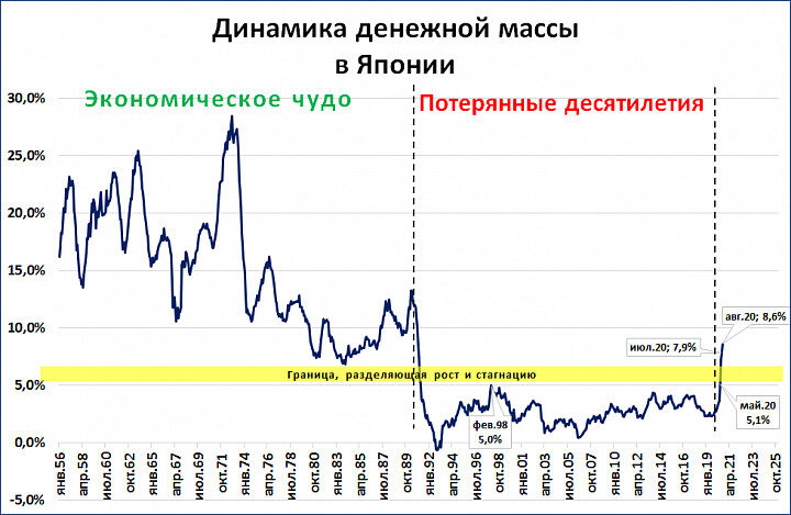 До 1990 года экономика Японии бурно росла и это называли "японским экономическим чудом". Затем последовали три десятилетия стагнации (средний рост ВВП составил в этот период 0,9% в год) - их назвали "потерянными десятилетиями". Застой в японской экономике хорошо объясняют деньги. Если во времена "экономического чуда" денежная масса росла темпами выше 7% в год, то во время "потерянных десятилетий" - менее 5%. Судя по всему, Япония сейчас вырывается из ловушки "потерянных десятилетий". Так, денежная масса в стране по итогам августа выросла на 8,6%. Таких темпов Япония не видела с 1990 года. Резюме Похоже, что предстоящее десятилетие для Японии уже не будет "потерянным", если Банк Японии продолжит наращивать денежную массу. См. также: "Япония выходит из тридцатилетнего застоя" "Как избежать "японской ловушки"". P.S. Для тех, кто использует Телеграм: Материалы этого блога можно на несколько часов (а иногда - дней) раньше прочитать на телеграм-канале "M2". В Телеграме его можно найти, введя