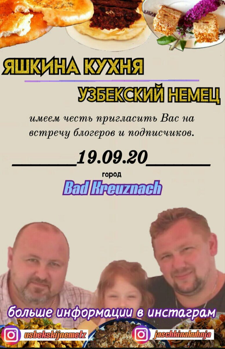 Дорогие Друзья! Информация по Поводу Встречи Блогеров и Подписчиков. Встреча состоится 19.09.2020. В Городе Бад Кройцнах (Bad Kreuznach). У кого есть желание провести с нами прекрасные выходные пишите в Инстаграм на странички Яшкиной Кухни и Узбекского Немца. Ссылки смотрите ниже. Ждём ваших ответов до 12. 09.2020. так как места ограничены. Стоимость Встречи 20 Евро с человека (10 Евро Предоплата). В сумму 20 Евро входит Готовка традиционных, восточных и европейских блюд, Дегустация, Общение, Мастер Класс по Приготовлению и т.д. Ждём хорошего настроения от вас Друзья Ссылка в Инстаграм Узбекского Немца: https://instagram.com/usbekskijnemetz/ Ссылка в Инстагра Яшкиной Кухни: https://www.instagram.com/jaschkinakuhnja/ а так же по вопросам Оплаты: jak_klein@web.de Друзья перевод Оплаты за Встречу проходит через PayPal: Ссылка на PayPal: https://paypal.me/kleinjak?locale.x=de_DE По поводу Ночёвки: кто желает остаться на ночь, обращайтесь в Инстаграме на страничку Яшкина Кухня! Ссылку