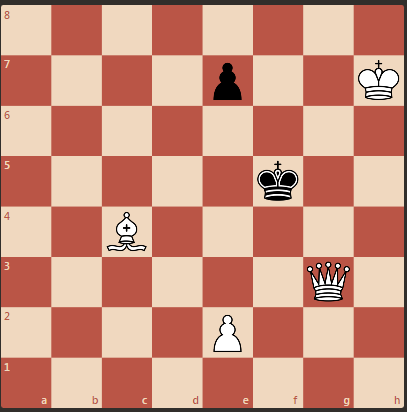 Очередная шахматная задача. Автор А. Кожакина, 2003 год. Черный король смело идет вререди своей единственной пешки. Но белые, используя силу своего ферзя, ставят мат в 2 хода. Смотрите задачу которую не решил КМС тут>>>