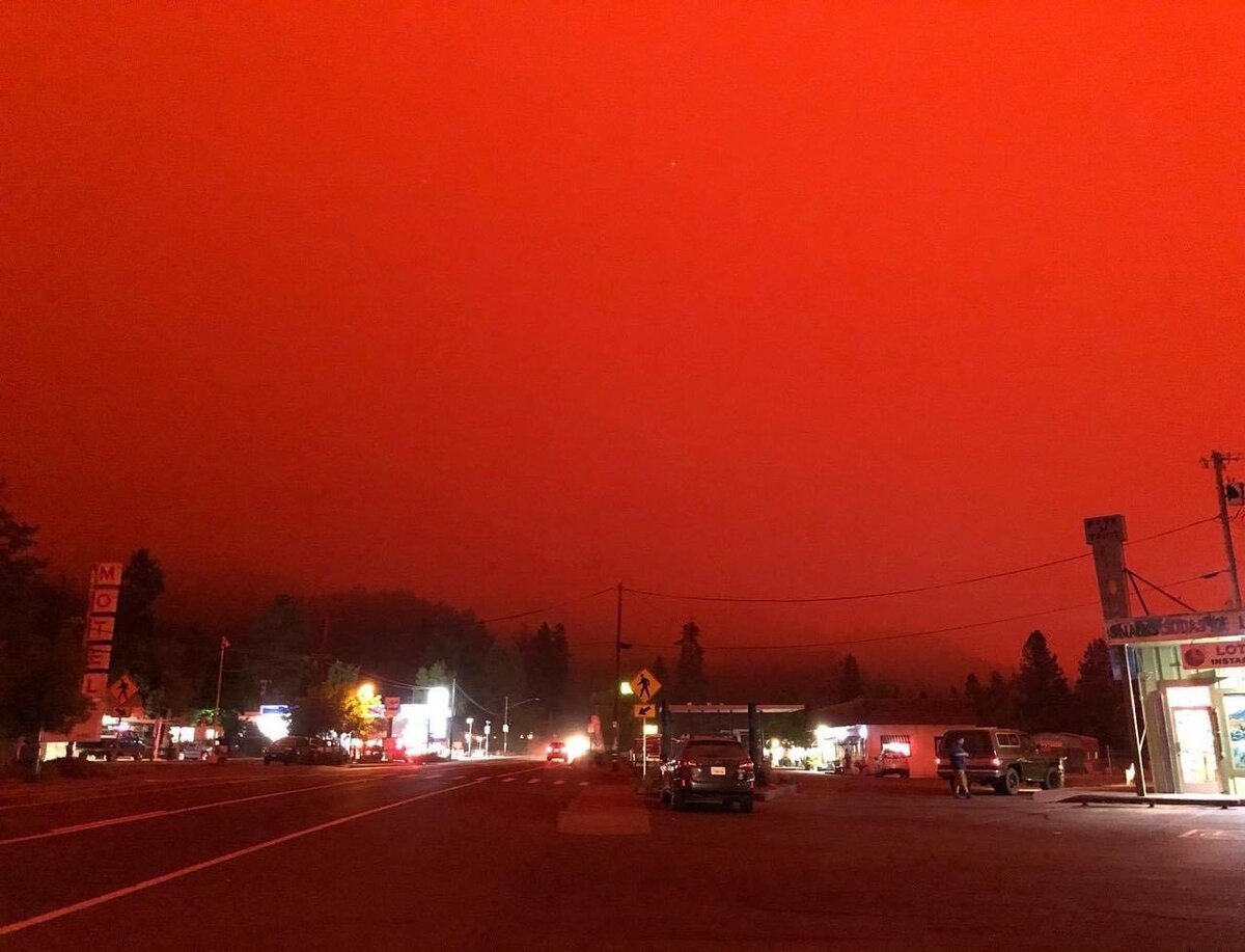 Этому поспособствовали крупные лесные пожары, которые охватили более 90 тысяч гектаров леса. Из-за пожаров и смога небо над городом Салем в Орегоне стало кроваво-красным
