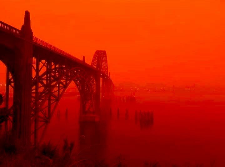 Этому поспособствовали крупные лесные пожары, которые охватили более 90 тысяч гектаров леса. Из-за пожаров и смога небо над городом Салем в Орегоне стало кроваво-красным