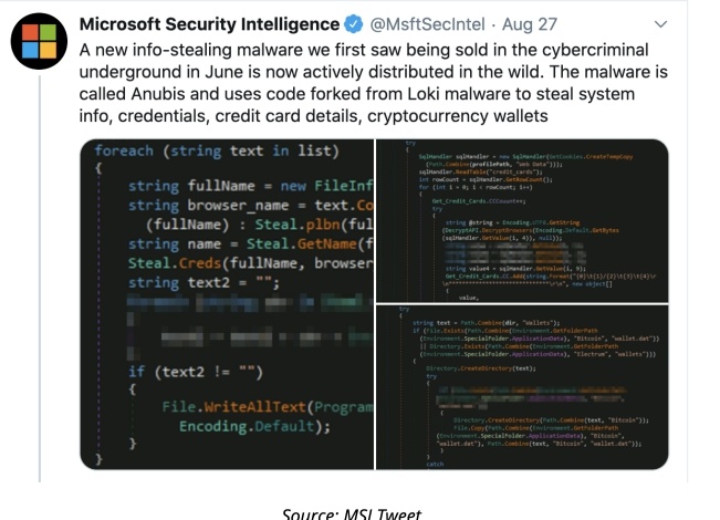В твиттере Microsoft Security Intelligence (MSI) 27 августа предупредила владельцев крипто-валют, которые также являются пользователями Windows, о том, что их средства в крипто-кошельках могут оказаться в опасности из-за новой вредоносной программы. Новая вредоносная программа, названная Anubis, похоже, использует код, вставленный Loki. Она крадет учетные данные криптокошелька, данные кредитной карты и другую ценную информацию у этих пользователей Windows. Согласно MSI, она впервые обнаружила вредоносную программу в июне в подполье киберпреступников. С таким же названием она связана и с другим мощным «банковским троянцем», который уже несколько месяцев нацелен на смартфоны под управлением ОС Android. MSI подчеркнул, что вредоносная программа, похоже, поддается контролю, заявив, что она была развернута только в «ограниченных, похоже, начальных кампаниях, которые до сих пор использовали лишь горстку известных URL-адресов загрузки и C2-серверов». Некоторые сайты обманывают людей, загружа