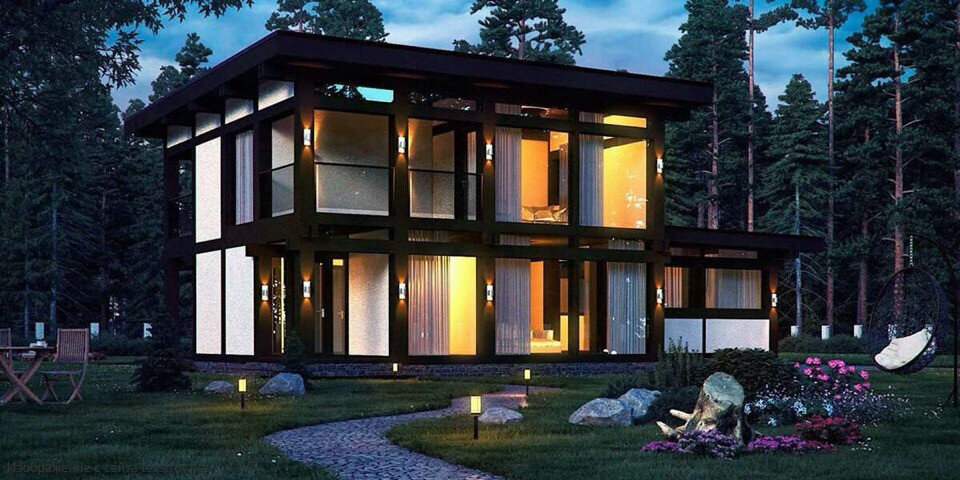 Дом общей площадью 177 м2. В качестве древесины используется сосна. Напомним, что фахверк - это способ постройки дома с использованием поперечных и продольных пересечений бруса, между которыми пространство заполняется кирпичом, блоками или окнами. Выглядит это как контрастный каркас. В этом случае с окнами.