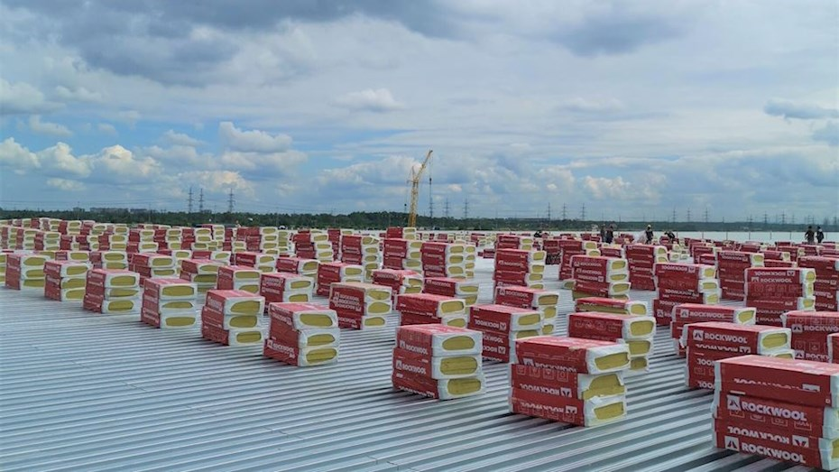 При строительстве складских корпусов агропарка «Нарт» используется технология быстровозводимых зданий, когда на металлический каркас крепятся заводские сэндвич-панели, а кровлю делают плоской по профилированному листу. Последняя выполняется по принципу «пирога», то есть сочетания нескольких слоёв различных материалов, и именно из-за этого она наиболее уязвима для огня. Малейшая ошибка при выборе компонентов сводит к нулю всю противопожарную защиту. Избежать неточностей и последующих происшествий позволяет специализированное решение для кровельных конструкций – теплоизоляционный пирог с негорючим утеплителем. На складах агропарка «Нарт» для данных целей выбрана каменная вата: плиты РУФ БАТТС В ОПТИМА и РУФ БАТТС Д СТАНДАРТ. В соответствии с ГОСТ 30244, материал относится к негорючим (НГ), волокна каменной ваты выдерживают, не плавясь температуры свыше 1000 0С и становятся барьером для распространения огня.