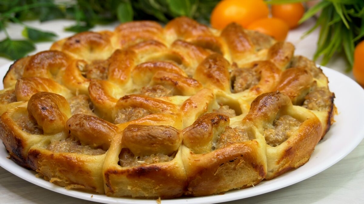 ✅ Муж Вас расцелует за этот мясной пирог! Еще один обалденный рецепт, для любимых мужчин! Сегодня хочу поделиться рецептом пирога с мясом "Беляш", еще его называют "Хризантема". Когда-то давно, когда я его готовила впервые, мы съели его вдвоем за раз, просто не могли оторваться. Так он и прижился у нас на кухне. Тесто, мягкое, пушистое, еще и пропитанное мясным соком. Это невероятная вкуснятина, от которой трудно оторваться. Рецепт: Для начинки: Способ приготовления Для начала приготовим тесто. В миску вливаем 130 мл теплого молока, 130 мл. теплого кефира, разбиваем 1 яйцо, добавляем 1 ч.л. соли, половину ч.л. сахара. Вливаем 50 мл растительного масла, добавляем 1 пачку сухих дрожжей, у меня весом 7 грамм. Перемешиваем и добавляем просеянную муку. Мне требуется 350-380 грамм муки. Тесто должно быть мягким, к рукам практически не липнуть. Кладем его обратно в миску и оставляем для подъёма в теплом месте на 1-1,5 часа. За это время подготовим начинку. В миску кладем 250 грамм фарша, сы