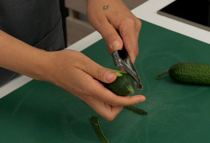 1. Огурцы тщательно очистить от кожи и нарезать крупными полукруглыми ломтиками. Сложить в глубокий салатник или широкую миску, в которой будет удобно смешивать. ИНСТРУМЕНТ Нож шефский