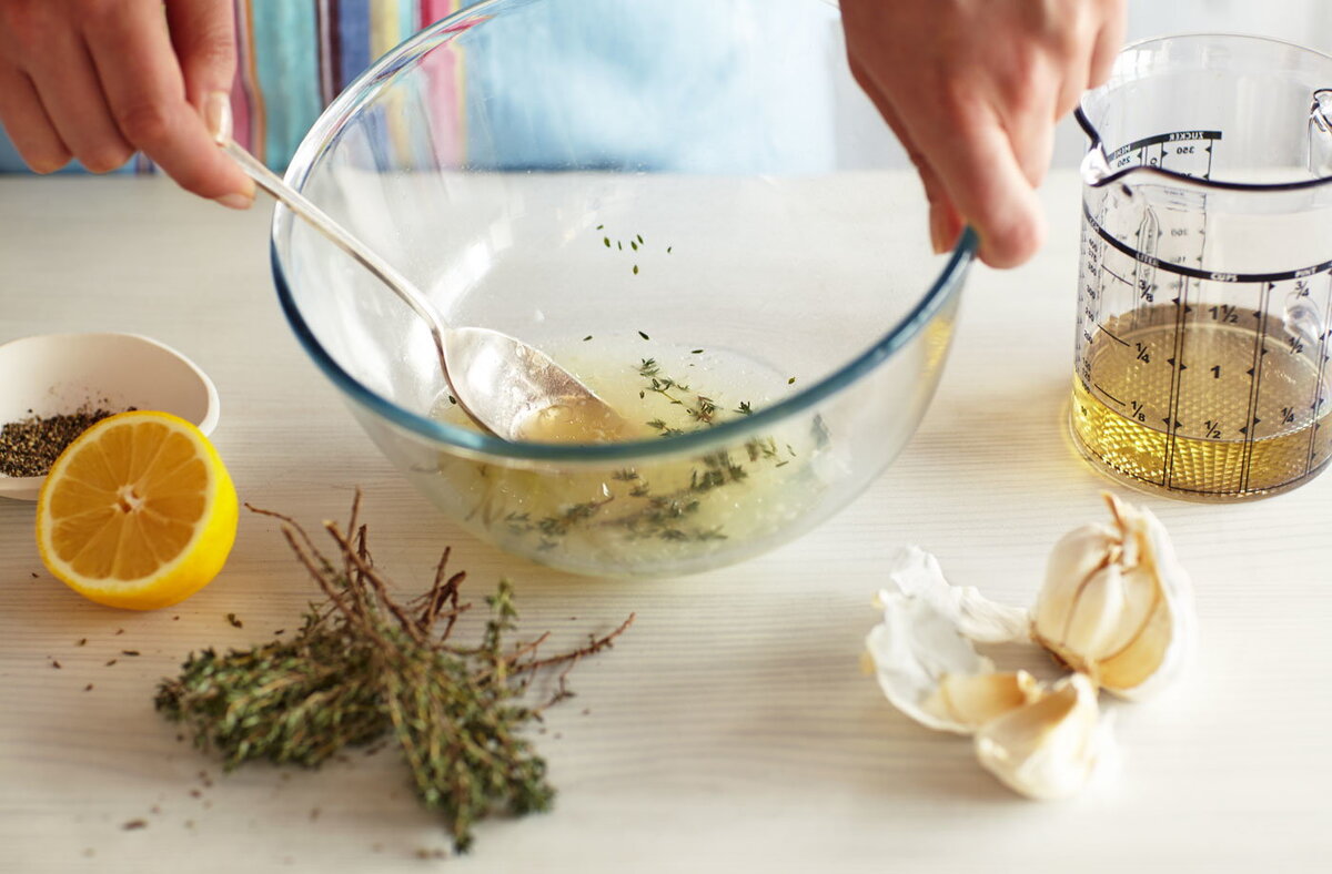 Свежая петрушка, нарезанная Смешайте маринад Для простого маринада, который отлично подходит для курицы (а также рыбы), смешайте 6 столовых ложек лимонного сока с 6 столовыми ложками оливкового масла, 1 измельченным зубчиком чеснока и несколькими веточками тимьяна или розмарина. Нарежьте курицу Перемешайте куриные грудки, чтобы они стали тоньше и готовились полностью. Для этого положите куриную грудку на доску и положите одну руку на нее сверху, затем острым ножом аккуратно разрежьте горизонтально посередине почти полностью. Раскройте и положите ровно. Встряхните пакет Положите курицу и маринад в большой пакет с застежкой-молнией и закройте его. Осторожно встряхните, чтобы вся курица была покрыта. Поместите пакет в боль