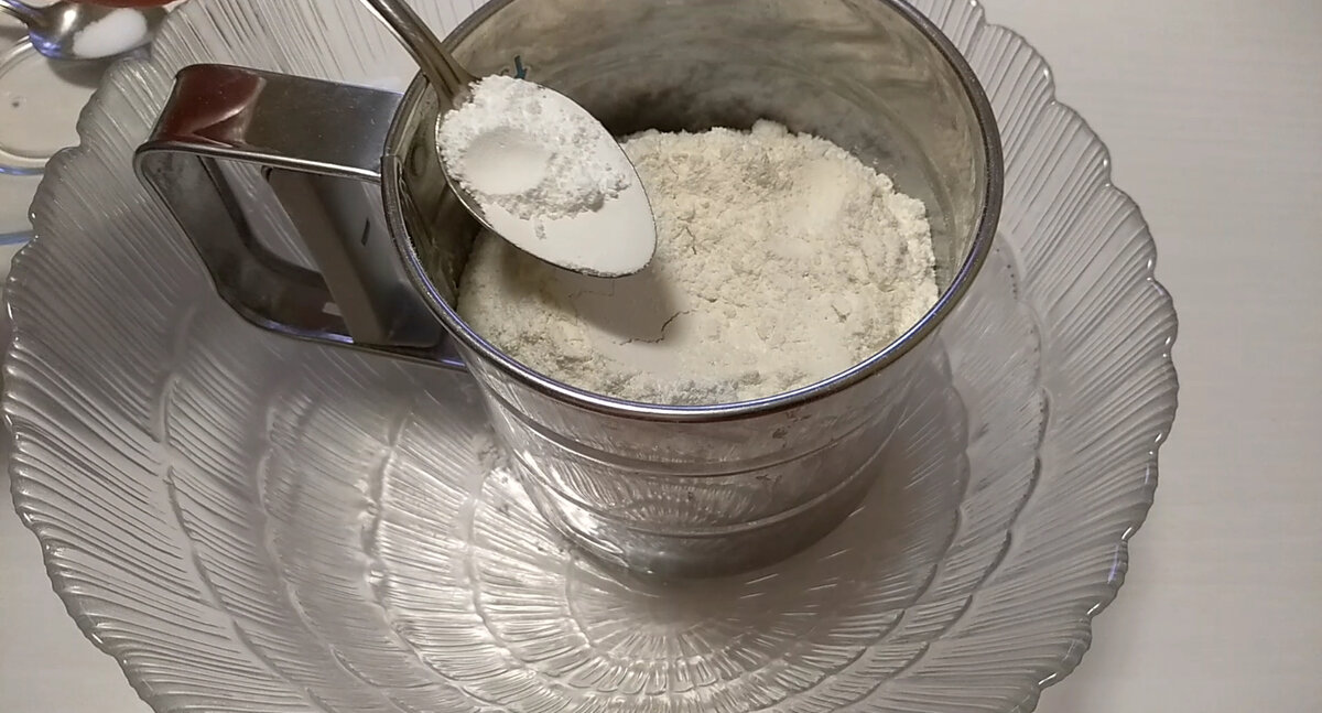 В чашу для просеивания муки насыпаем 180 г муки в/с, добавляем 1 ч л разрыхлителя, щепотку соли и просеиваем.