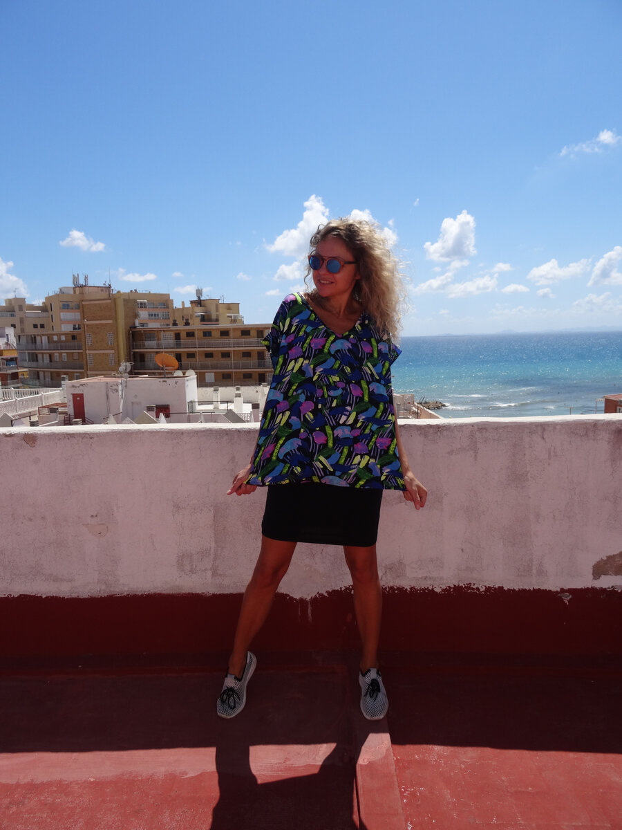 Здравствуйте! Сегодня буду переделывать эту большую яркую тунику. Не знаю какой это размер, но точно больше, чем XL. Очень мне нравится ее принт. Да и ткань на ощупь очень приятная. Это нечто среднее между хлопком и тонкой плащевкой. То есть, очевидно что она не будет скатываться и сильно мяться, поэтому можно сделать из нее юбку.