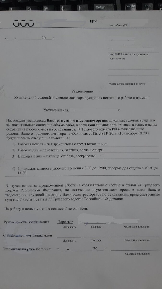 И вот сегодня мужу вручили на подпись уведомление, и, как оказалось, эта не та форма, которую мы ожидали увидеть. Руководство фирмы пошло другим путём и решило, не нарушая Трудового кодекса, сохранить денежные средства в фирме. А именно - довести сотрудника до написания заявления на увольнение по собственному желанию. Вот это уведомление
