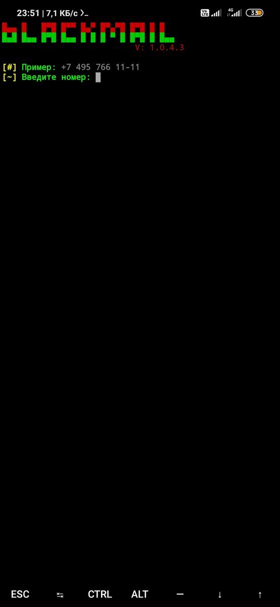 И так, для начала вводите эти команды в приложение Termux (установить можно с Play Market или AppStore): pkg update && upgrade pkg install python apt install git pip install requests bs4 git clone https://github.com/DataSC3/No-BlackM cd No-BlackM python No-BlackMail.py Копируйте и вставляйте каждую команду по очередности в окно терминала, чтобы избежать ошибок. После всего проделанного, у вас откроется вот это окно: Пишем номер, которой вы хотите пробить, иногда пригодится VPN. В таком формате подается информация о номере:
