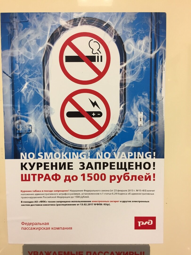 Курение. Это наверное одна из самых раздражающих вещей. Курение в поезде ЗАПРЕЩЕНО, согласно Федеральному закону «Об охране здоровья граждан от воздействия окружающего табачного дыма и последствий потребления табака». Нарушение закона влечет наложение административного штрафа. Все об этом знают, но всё равно находятся пассажиры, которые думают, что они самые скрытные на свете и курят в туалете.