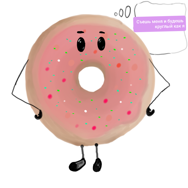 Долгое время я думала, что рисовать надо людей. Сегодня поняла, что еда тоже может шутить. Например, можно нарисовать остроумного пончика. Внутренний круг должен быть чуть темнее внешнего. Закрашиваем одним цветом. Я решила сделать правую сторону чуть светлее и покрасила ее "краской" на два тона светлее. Теперь рисуем "глазурь", я сделала ее прозрачной и нанесла в несколько слоев. В середине пончика цвет немного темнее чем по краям, края немного подкрасила другим оттенком. Добавила немного цветных точек, правый край подкрасила "краской" на два тона темнее основной. Пончики же иногда посыпают разноцветными "украшениями". Глаза решила сделать овальными. Дорисовала брови, руки и ноги, блики на глазах. Добавляем какую-нибудь оригинальную фразу и готово. Вот такой пончик у меня получился. Спасибо за то, что дочитали публикацию до конца! Канал "Хочу рисовать!"