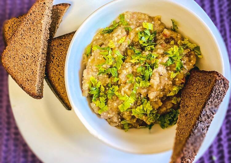 Вынимаем из духовки. Пока перец и баклажаны будут остывать помидоры, лук, петрушку перемалываем в мясорубке. Или режем кубиками.